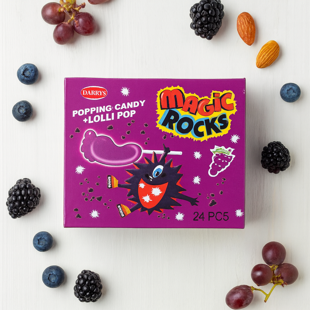 Each pack contains 24 individually wrapped sachets, ensuring freshness and convenience. Loved for its fizzy texture and vibrant flavours, Darrys Magic Rock is a hit with kids, adults, and anyone who enjoys a fun and playful treat.
